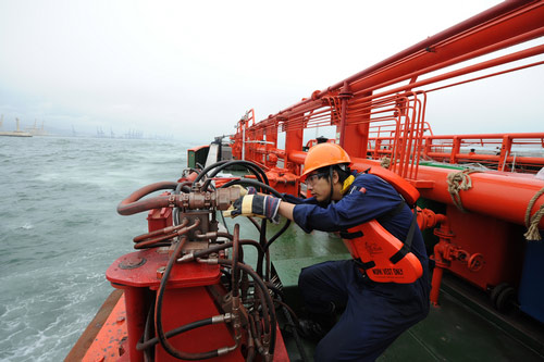 此次中國(guó)海油調(diào)派的“海洋石油252”多功能環(huán)保船于6月22日剛剛交付使用,是國(guó)內(nèi)第一艘采用兩側(cè)內(nèi)置式溢油回收設(shè)備的環(huán)保船,溢油回收效率高,速度快。在大連海上油污清理現(xiàn)場(chǎng),“海洋石油252”首次“亮劍”的出色表現(xiàn)贏得各方人士的一致好評(píng)。