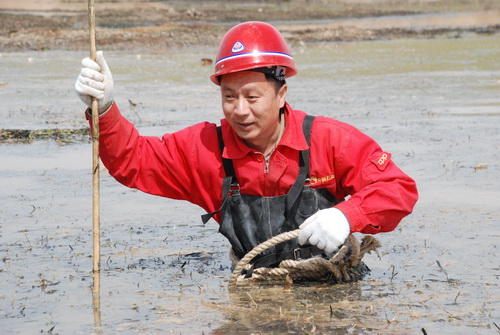 焊接機組電焊班長周平涉水測量河道。