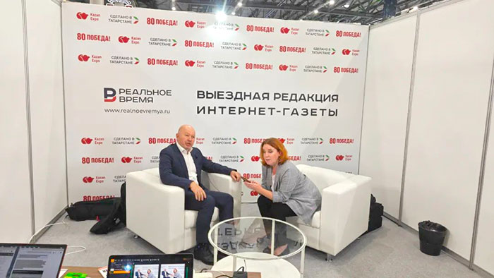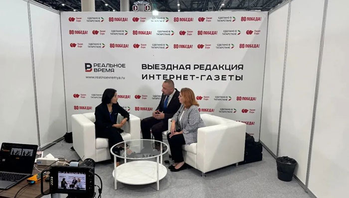 中國展團的精彩亮相也獲得當地媒體廣泛關注。展會期間,俄媒體《реальное время》特邀中國展團代表接受專訪,振威國際會展集團董事副總裁孫宇、深圳青鈿信息科技有限公司俄羅斯分公司副總經理康斯坦丁、北京昊圖科技有限公司副總經理劉亞利等暢談合作前景。孫宇在采訪中表示,振威國際會展集團始終致力于搭建高水平的國際能源合作平臺,愿借此次展會,進一步推動中俄企業之間的務實合作。